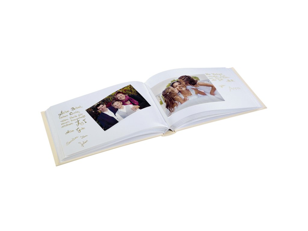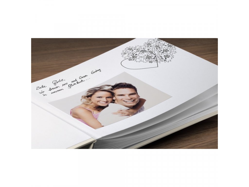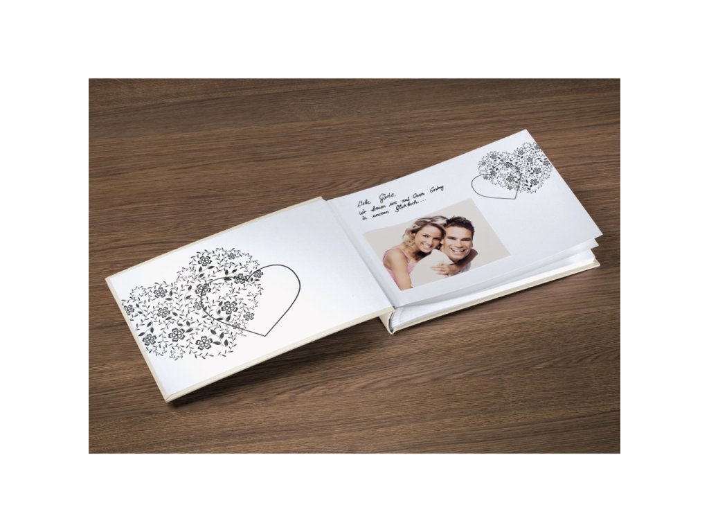- album a zároveň kniha hostů v jednom, se spoustou místa pro lepení fotografií, blahopřání, pozdravy, anekdoty …- tvrdé desky z texturovaného papíru s romantickým motivem srdce zvýrazněným lesklým povrchem