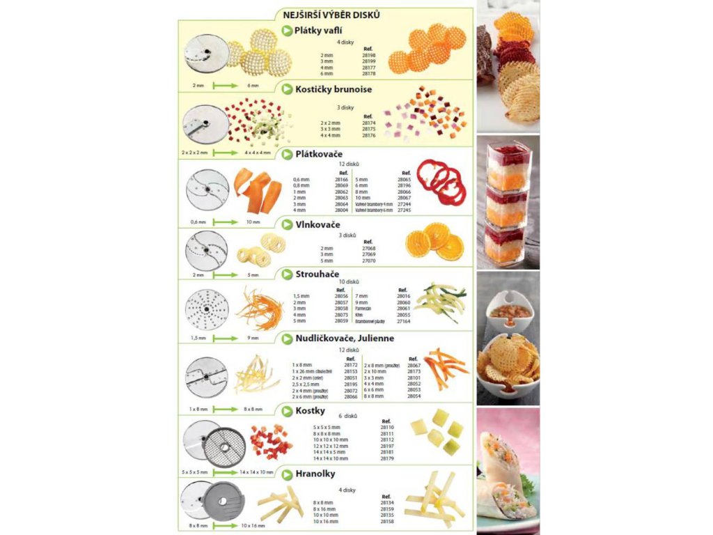 - Plátkuje, vlnkuje, strouhá, nudličkuje, kostičkuje na velké a malé (brunoise) kousky, hranolkuje.